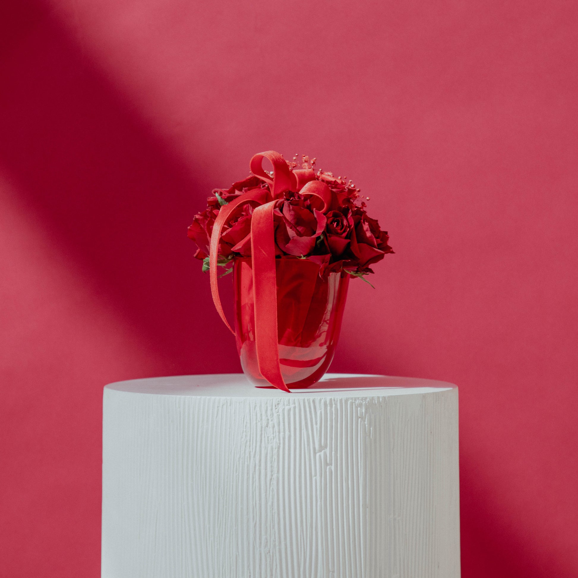 12 red roses with accessories in a red glass vase.
