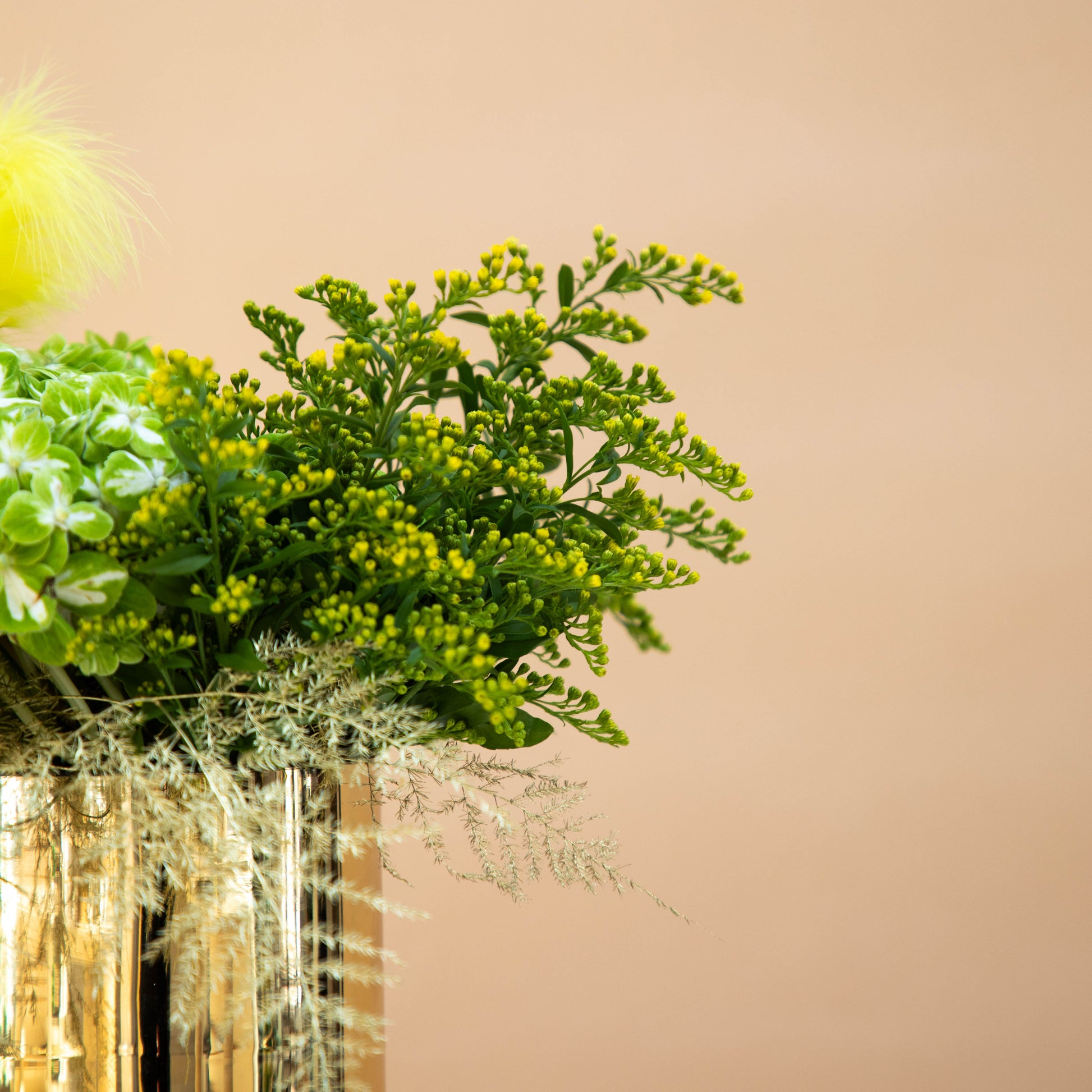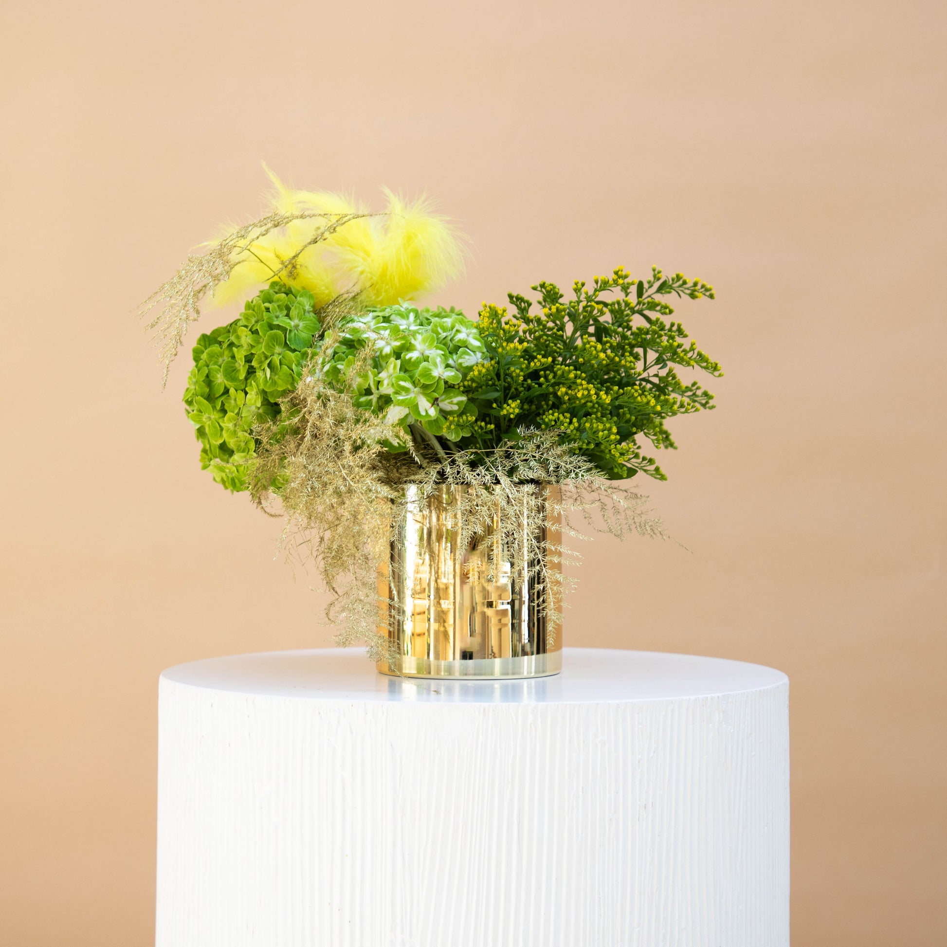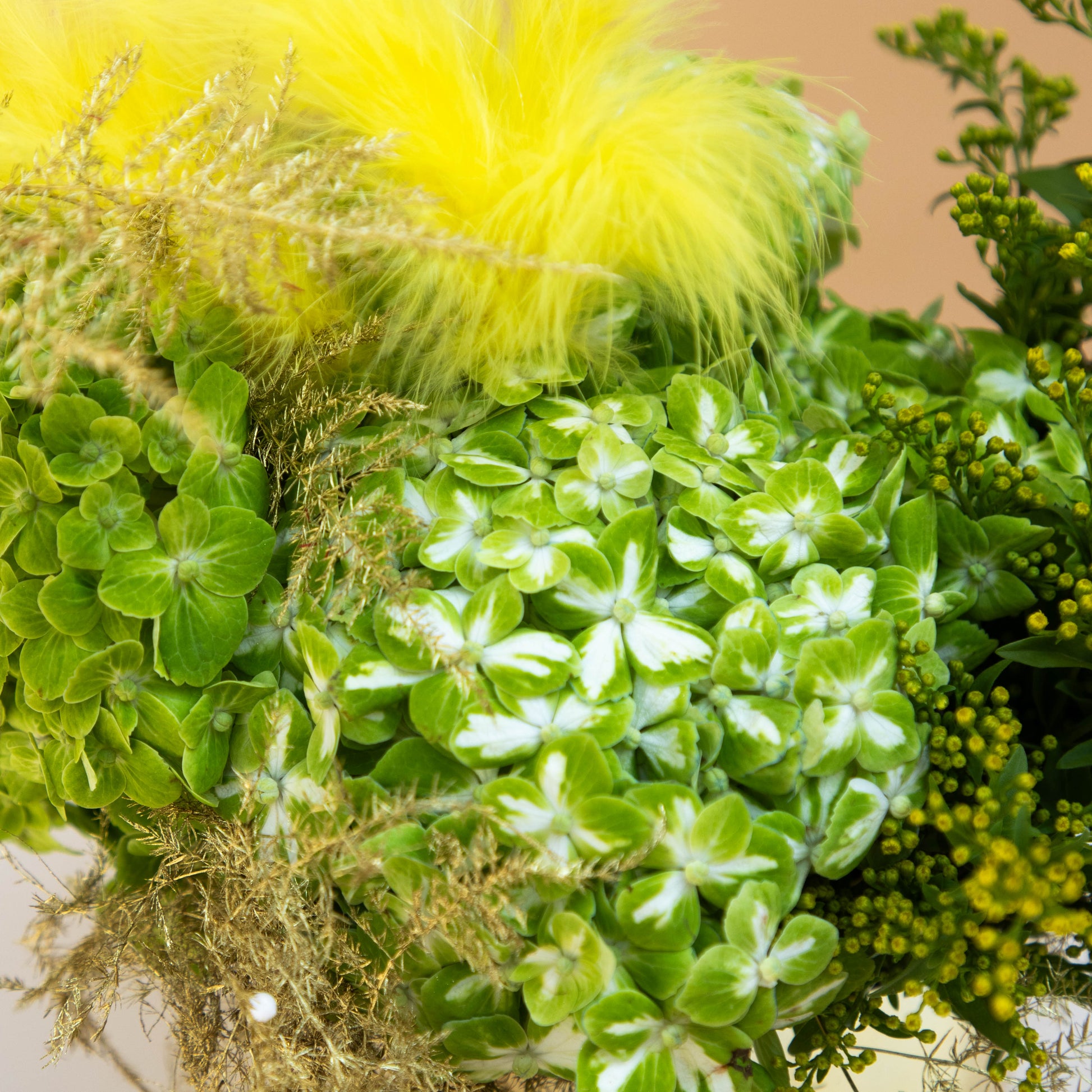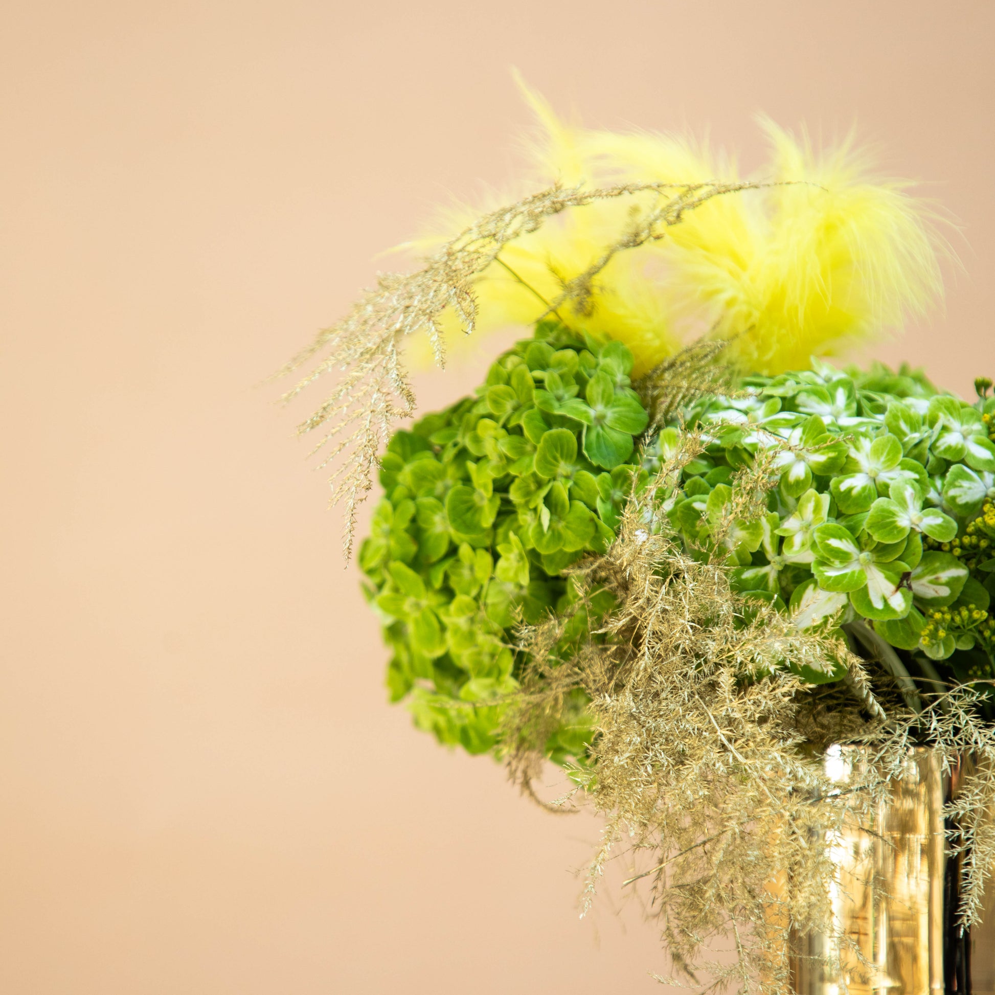 Green Hydrangeas, solidago, and asparagus with yellow feathers in a gold glass vase.