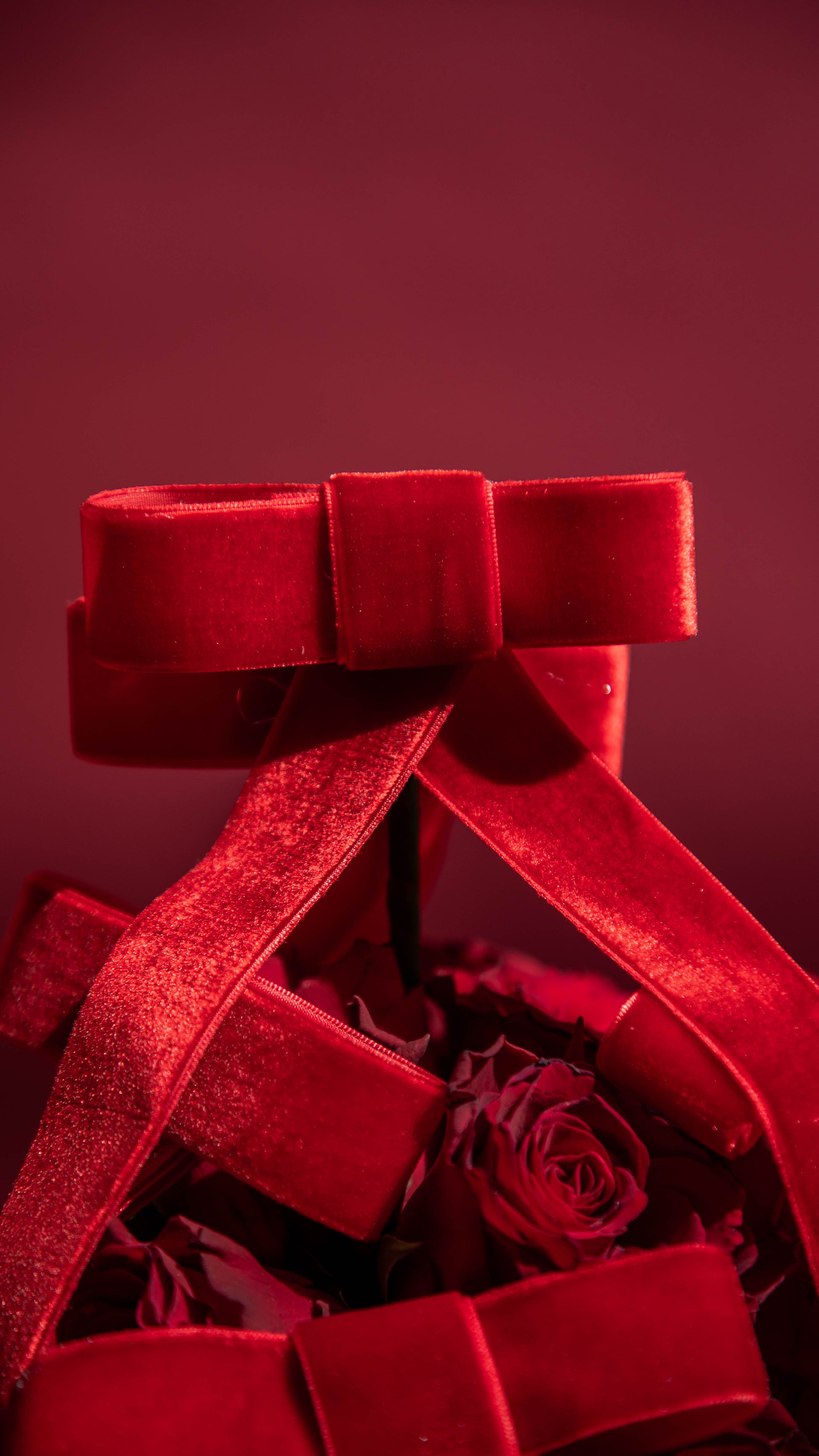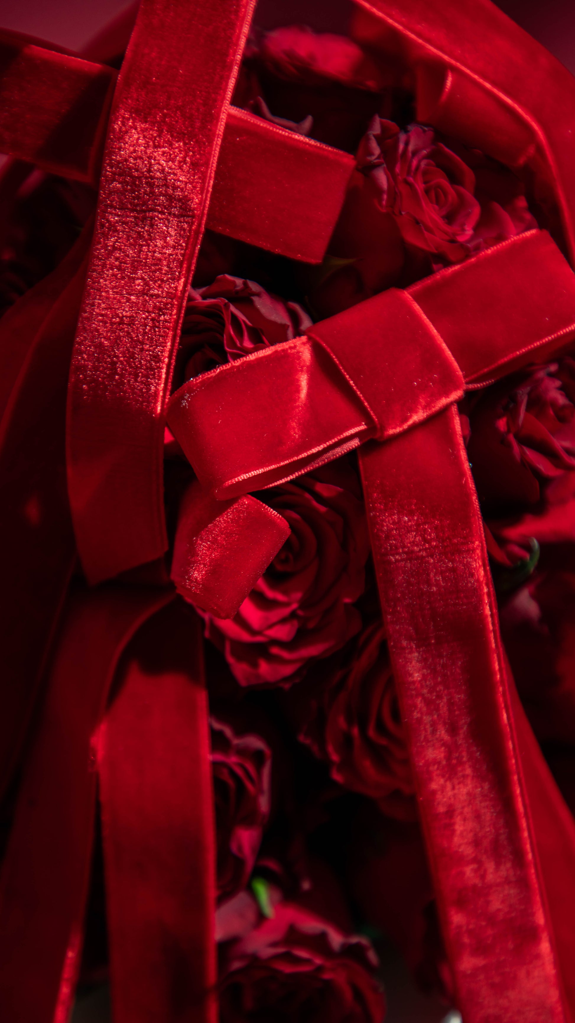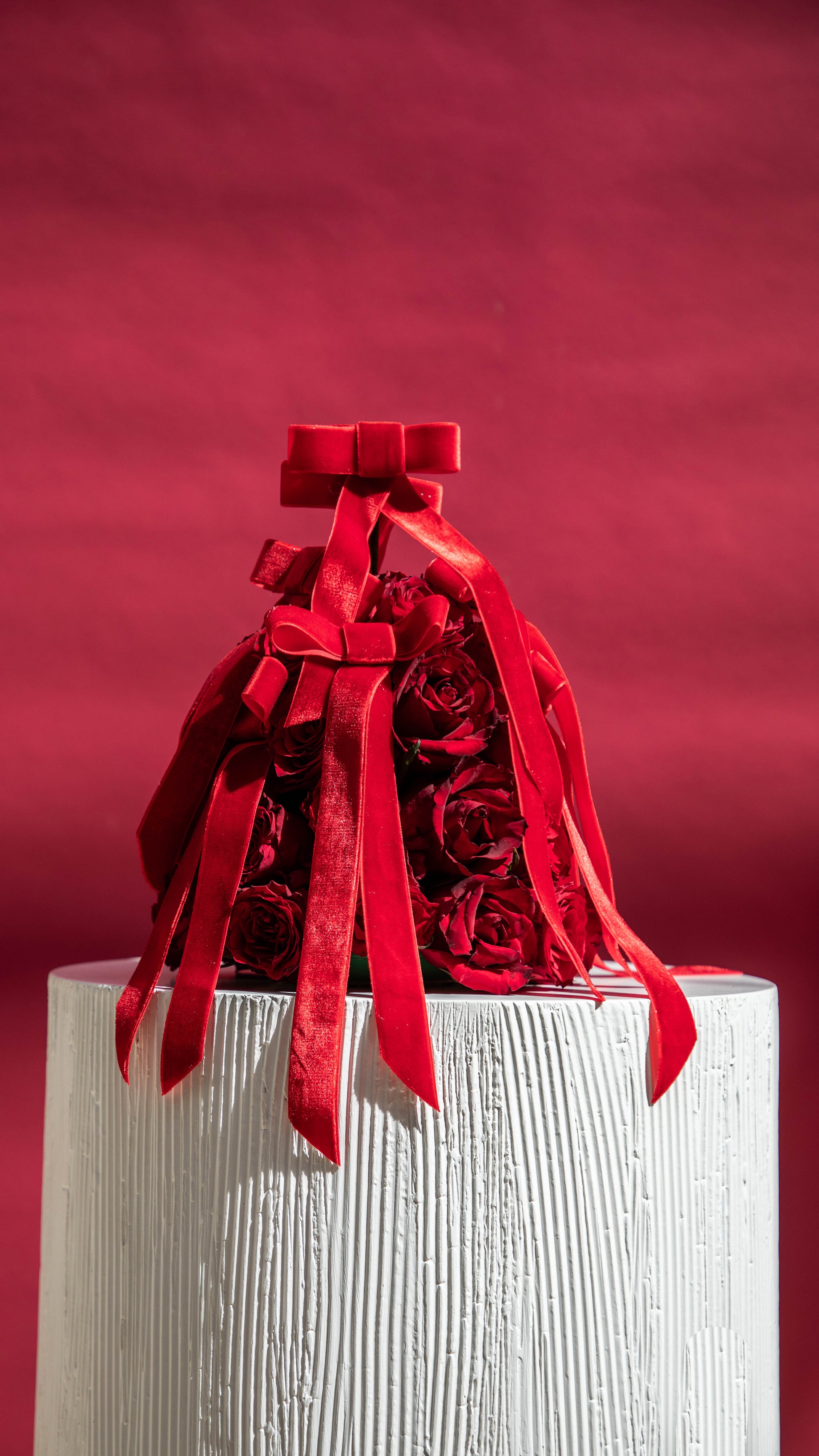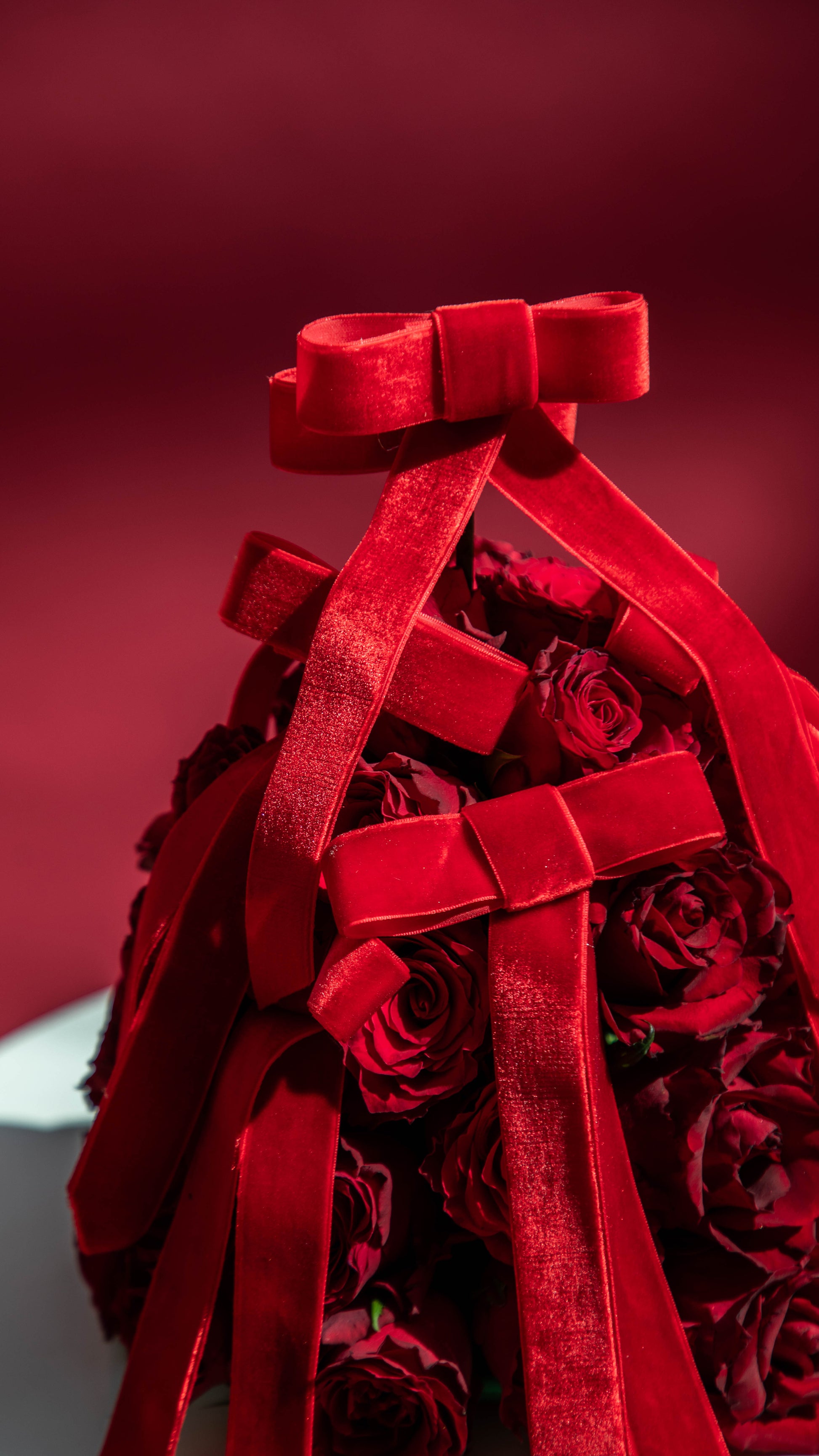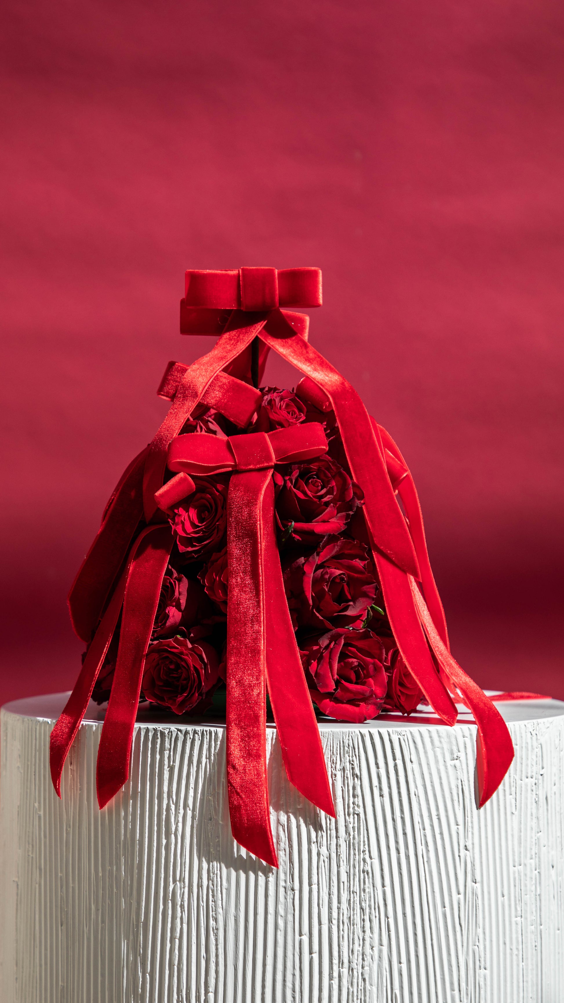 Red roses pyramid with red velvet ribbons.
