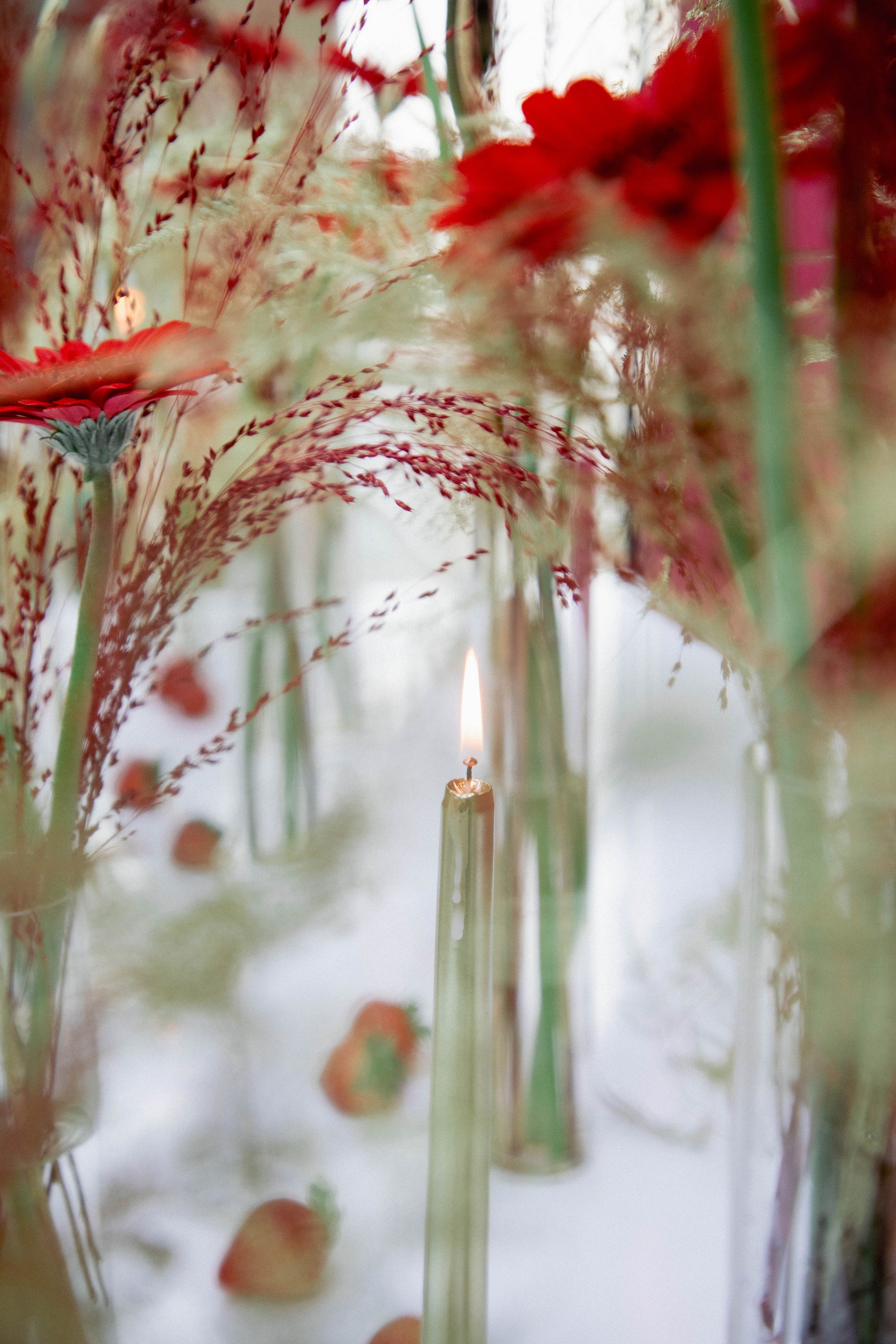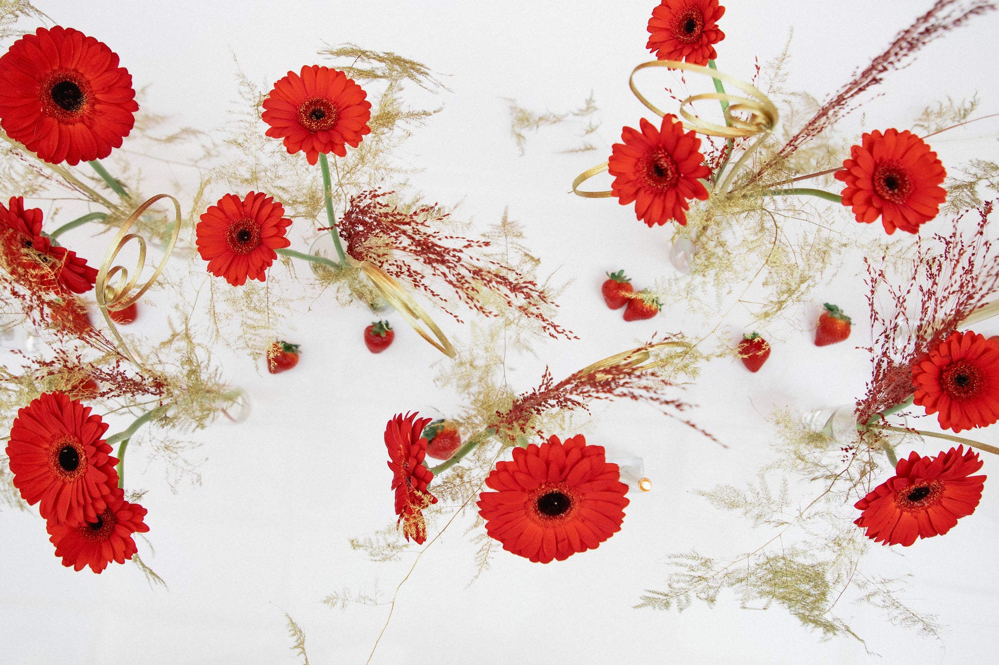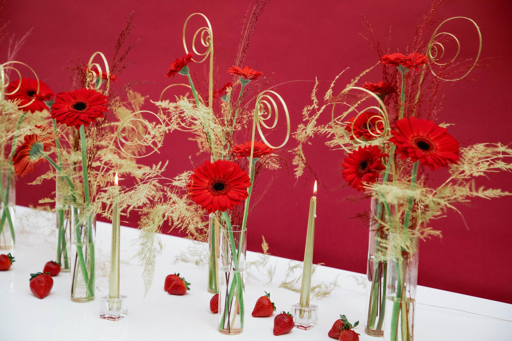 Vase includes: 3 Gerbera flowers in glass vase with gold accessories. Suitable for set ups.